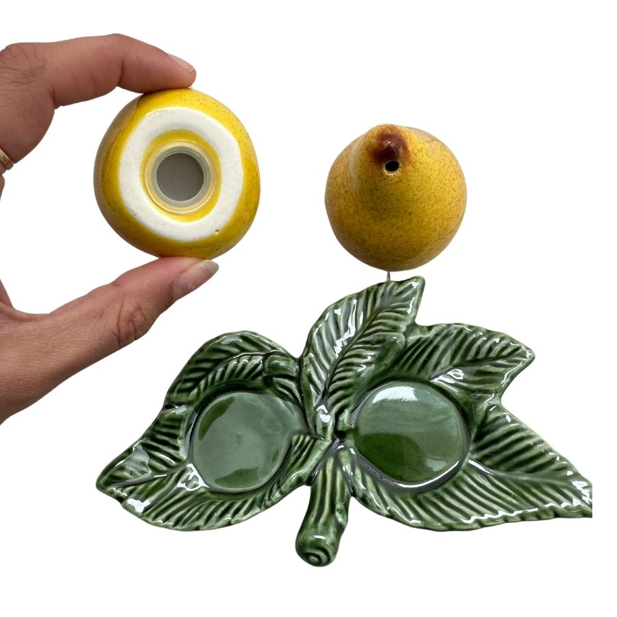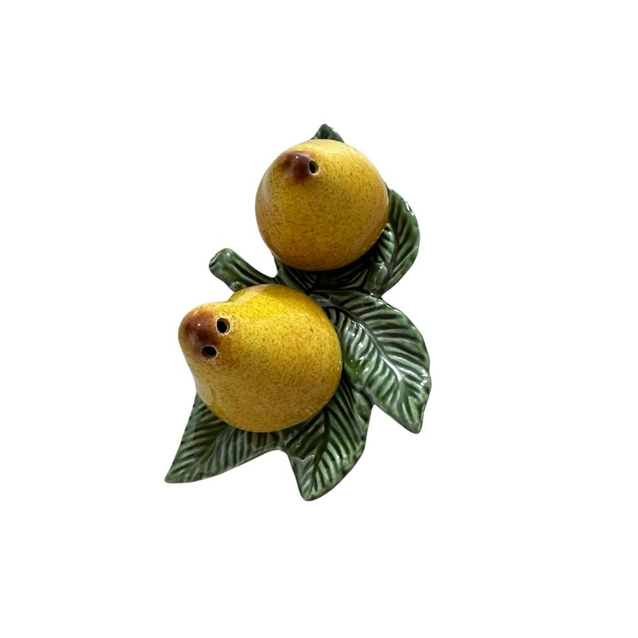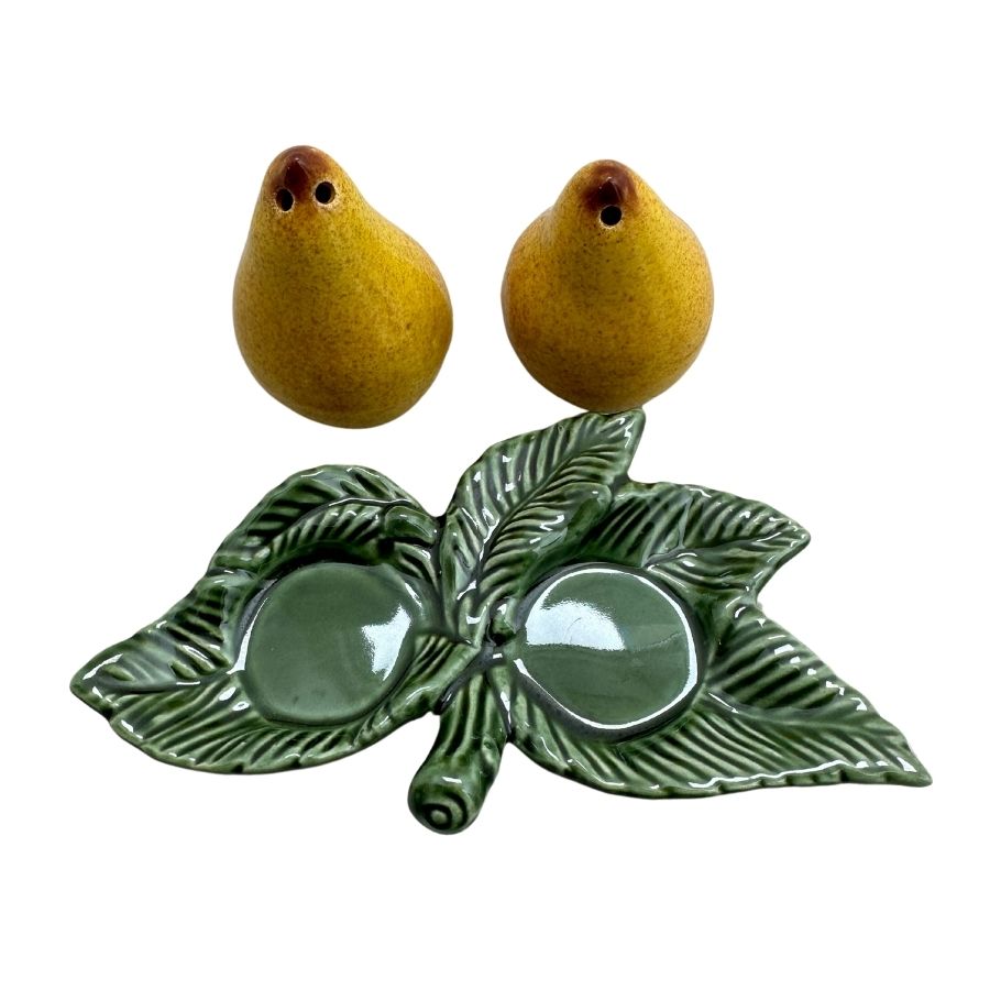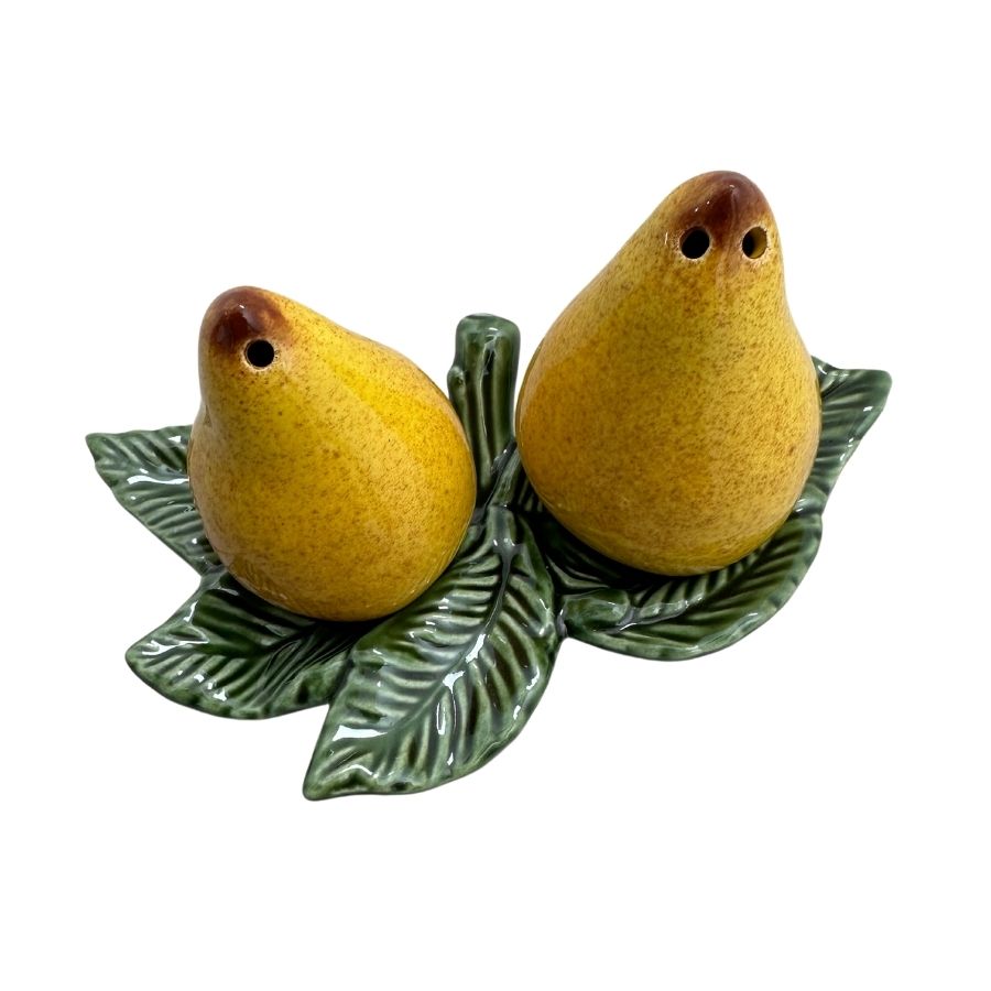 Add a touch of whimsy to your table with this charming ceramic salt and pepper dispenser set! Shaped like a pear and paired with a leaf-shaped plate. Straight from Portugal, it's a traditional treasure that's 16cm long (plate) and 9cm high (pear + plate). Perfect for sprucing up your meals with a pinch of fun and a dash of style. Get ready to season with a smile!