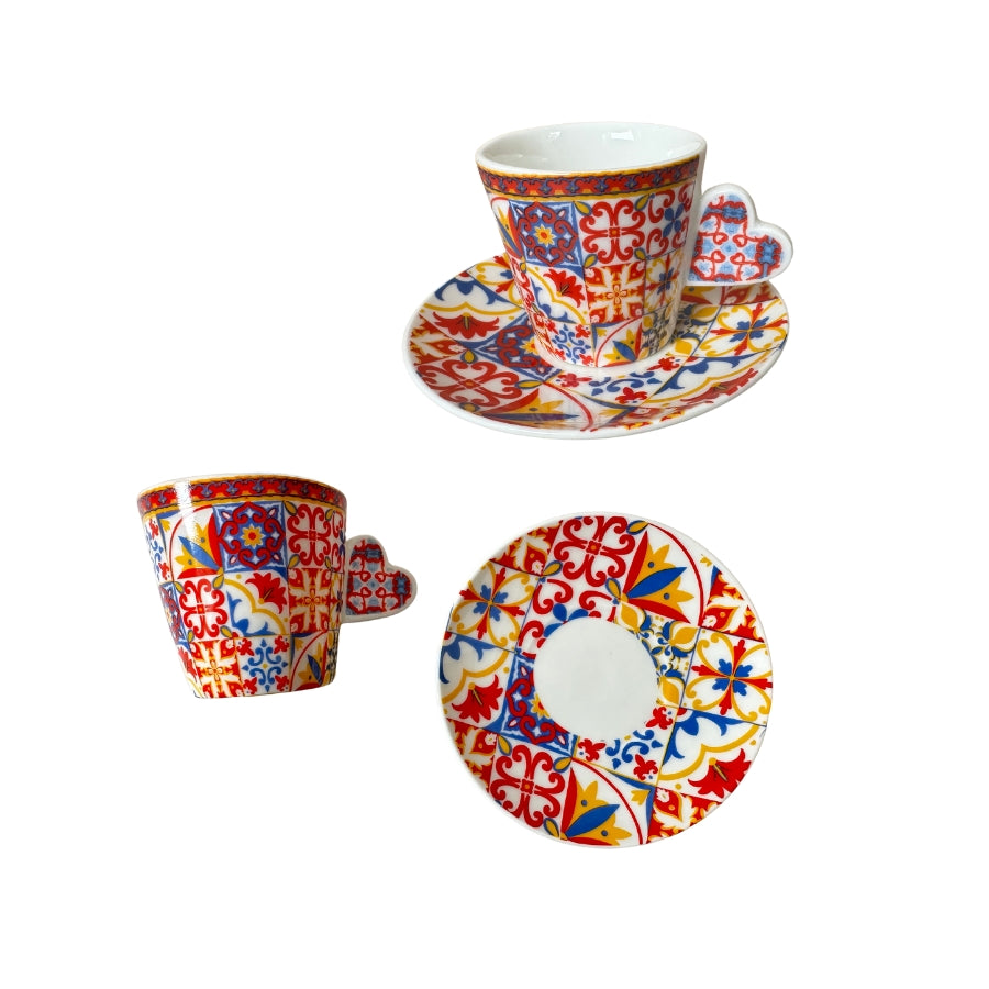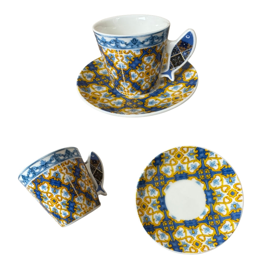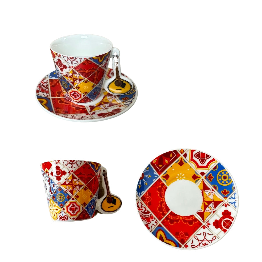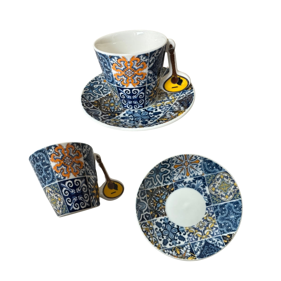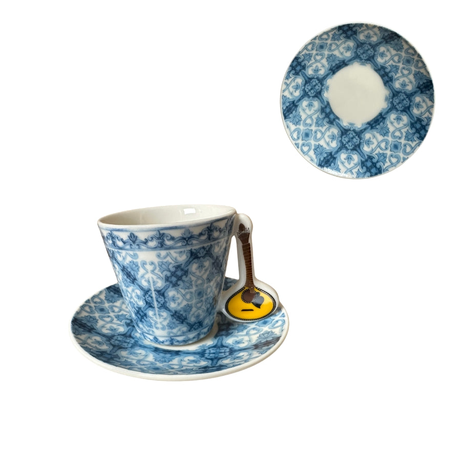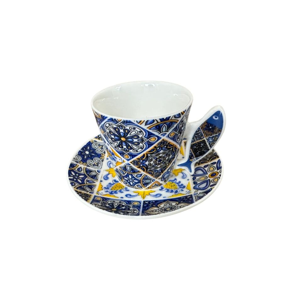 Bring the charm of Portugal to your coffee or tea moments with our unique set of two Portuguese tile-patterned cups and saucers. Each cup handle is crafted in the shape of iconic Portuguese symbols: a Portuguese guitar, a sardine, or a Viana heart.